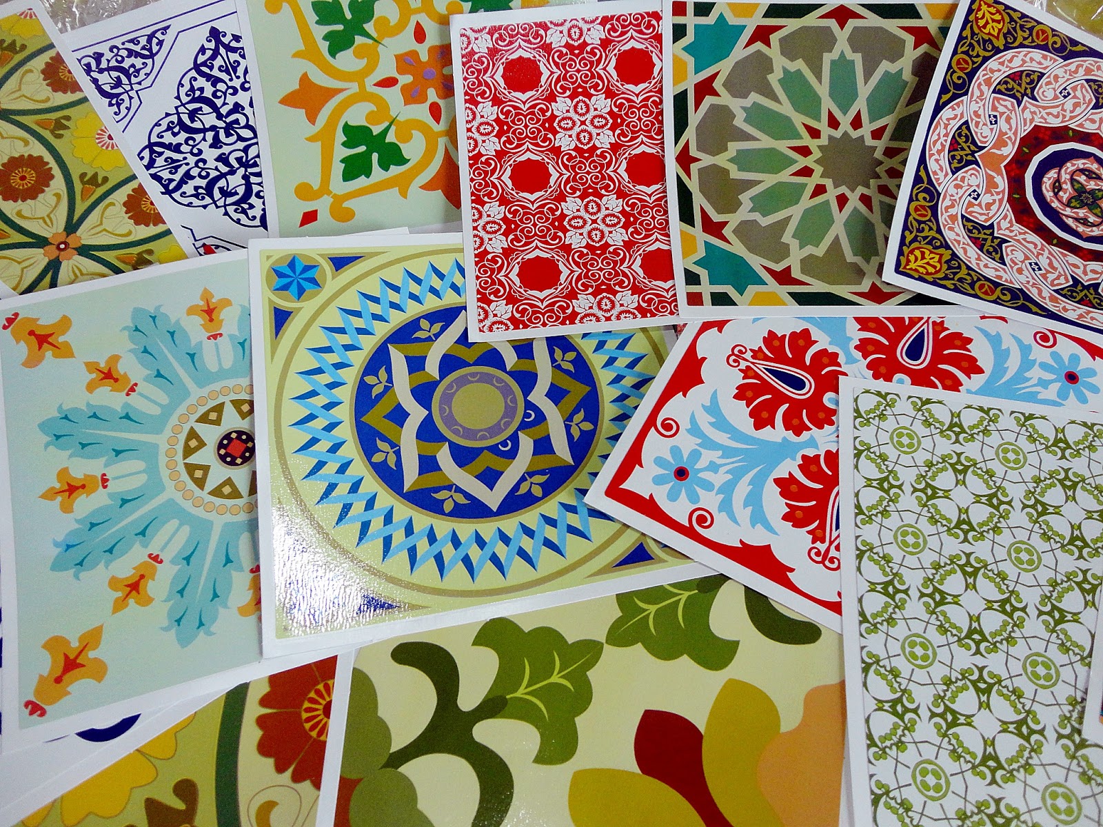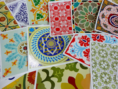 Para matar a curiosidade de vocês, dêem só uma olhadinha nas estampas que vem no kit de azulejos (kit ladrilho) ... ao todos são 16 estampas lindas e com um brilho semelhante ao azulejo. Muito bacana o efeito.